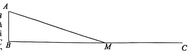 Trong Hình dưới, quãng đường AB dài 5 km, quãng đường BC dài 26 km, góc ABC là góc vuông. Một người có kế hoạch đi xe đạp, đi thẳng từ A đến một vị trí M trên quãng đường BC với tốc độ 12 km/h, sau đó lại đi thẳng từ M đến C với tốc độ 13 km/h. Người đó cần chọn vị trí M cách B một khoảng bằng bao nhiêu km để tổng thời gian đi từ A đến M và từ M đến C là ít nhất?