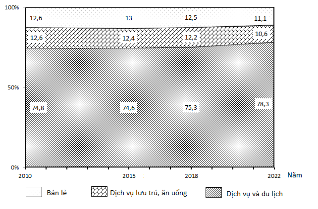 Tỉ trọng dịch vụ và du lịch năm 2010 là 12,6% và năm 2022 là 9,1%. Do đó, tỉ trọng giảm 3,5%. Nhận xét này là đúng.