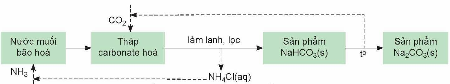 Trong công nghiệp, sodium hydrogencarbonate (baking soda) và sodium carbonate (soda) được sản xuất bằng phương pháp Solvay từ nguyên liệu chính là đá vôi, muối ăn, ammonia và nước. Quá trình sản xuất theo phương pháp Solvay bao gồm các công đoạn như trong sơ đồ sau: