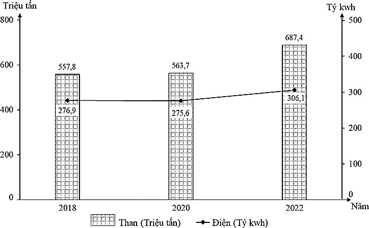 - Sản lượng than cũng có xu hướng tăng từ 557,8 triệu tấn (năm 2018) lên 687,4 triệu tấn (năm 2022).