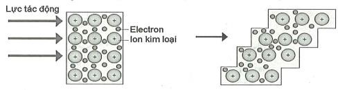 Hình ảnh cho thấy khi áp dụng một lực tác động lên mạng tinh thể của kim loại, các lớp nguyên tử (ion kim loại) có thể trượt lên nhau mà không bị gãy hoặc vỡ. Điều này liên quan đến sự dịch chuyển của các lớp ion kim loại trong mạng lưới mà không phá vỡ cấu trúc tinh thể của chúng.