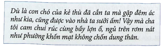Dù là con chó của kẻ thù đã cắn ta mà gặp đêm ác như kia, cũng được vào nhà ta sưởi ấm! Vậy mà cha tôi cam chui rúc cùng bầy lợn ổ, ngủ trên rơm nát như phường khốn mạt không chốn dung thân.