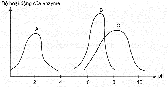 Biểu đồ sau thể hiện độ hoạt động của các enzyme A, B, C xúc tác cho các phản ứng sinh hoá trong cơ thể theo pH của môi trường phản ứng: