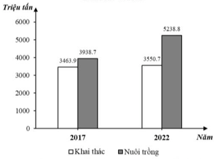 Nhận xét nào sau đây đúng về sự thay đổi sản lượng khai thác và nuôi trồng thuỷ sản năm 2022 so với năm 2017 của nước ta?