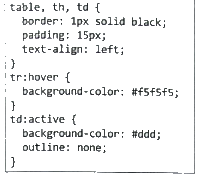 th (table header) mặc định có dạng chữ in đậm.tr:hover xác định rằng khi di chuột lên một hàng (trừ dòng tiêu đề không được áp dụng do thiếu quy định cụ thể), màu nền sẽ chuyển thành #f5f5f5.td:active vẫn có thể được xử lí khi một ô trong bảng được nhấn giữ (active pseudo-class áp dụng cho bất kỳ phần tử nào đang trong trạng thái hoạt động, không chỉ siêu liên kết).td:active để đổi màu nền thành #ddd khi ô được nhấn giữ.Chú ý khi giải