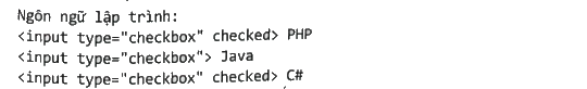<input type="checkbox" checked> PHP: checkbox cho PHP được chọn mặc định.<input type="checkbox"> Java: checkbox cho Java không được chọn mặc định.<input type="checkbox" checked> C#: checkbox cho C# được chọn mặc định.Phương án A biểu diễn đúng điều này với hai checkbox được chọn cho PHP và C#, checkbox không chọn cho Java. Đây là đặc điểm của checkbox, khác với các radio button mà mỗi nhóm chỉ chọn được một mục.