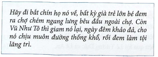 KIM PHƯỢNG: Ngươi muốn dùng nó sao? Đầu ngươi cũng không vững hơn đầu nó (nghiến răng, mặt lộ vẻ tàn ác ghê gớm). Hãy đi bắt chín họ nó về, bất kỳ già trẻ lớn bé đem ra chợ chém ngang lưng bêu đầu ngoài chợ. Còn Vũ Như Tô thì giam nó lại, ngày đêm khảo đả, cho nó chịu muôn đường thống khổ, rồi đem làm tội lăng trì.