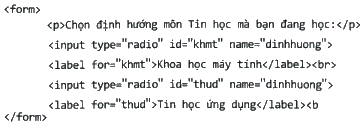 <label for="khmt"> được liên kết với <input id="khmt">, nên khi nhấn vào văn bản "Khoa học máy tính", nút radio tương ứng sẽ được chọn.<h1> định dạng đoạn văn bản nổi bật hơn <p> vì nó thường có kích thước lớn hơn và đậm hơn.name="dinhhuong" nghĩa là chỉ có thể chọn một trong hai.submit và cũng không có thuộc tính action trong thẻ <form> để xác định URL mà dữ liệu sẽ được gửi tới.Chú ý khi giải