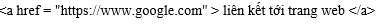 href, liên kết đến URL "https://www.google.com". Đây là cách thông thường để tạo một đường liên kết đến trang web khác.target="_blank", vì thế liên kết sẽ mở trong cửa sổ hoặc tab hiện tại, không phải là cửa sổ hoặc tab mới theo mặc định.href phải được khai báo. Nếu không, thẻ <a> sẽ không dẫn đến đâu khi nhấp vào.Chú ý khi giải