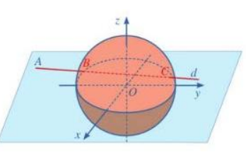 $\left. \Rightarrow\left\{ \begin{array}{l} {OB = \sqrt{\left( {- 1000 + 100t_{1}} \right)^{2} + \left( {- 300 + 80t_{1}} \right)^{2} + \left( {100\sqrt{11}} \right)^{2}} = R = 600} \\ {OC = \sqrt{\left( {- 1000 + 100t_{2}} \right)^{2} + \left( {- 300 + 80t_{2}} \right)^{2} + \left( {100\sqrt{11}} \right)^{2}} = R = 600} \end{array} \right. \right.$