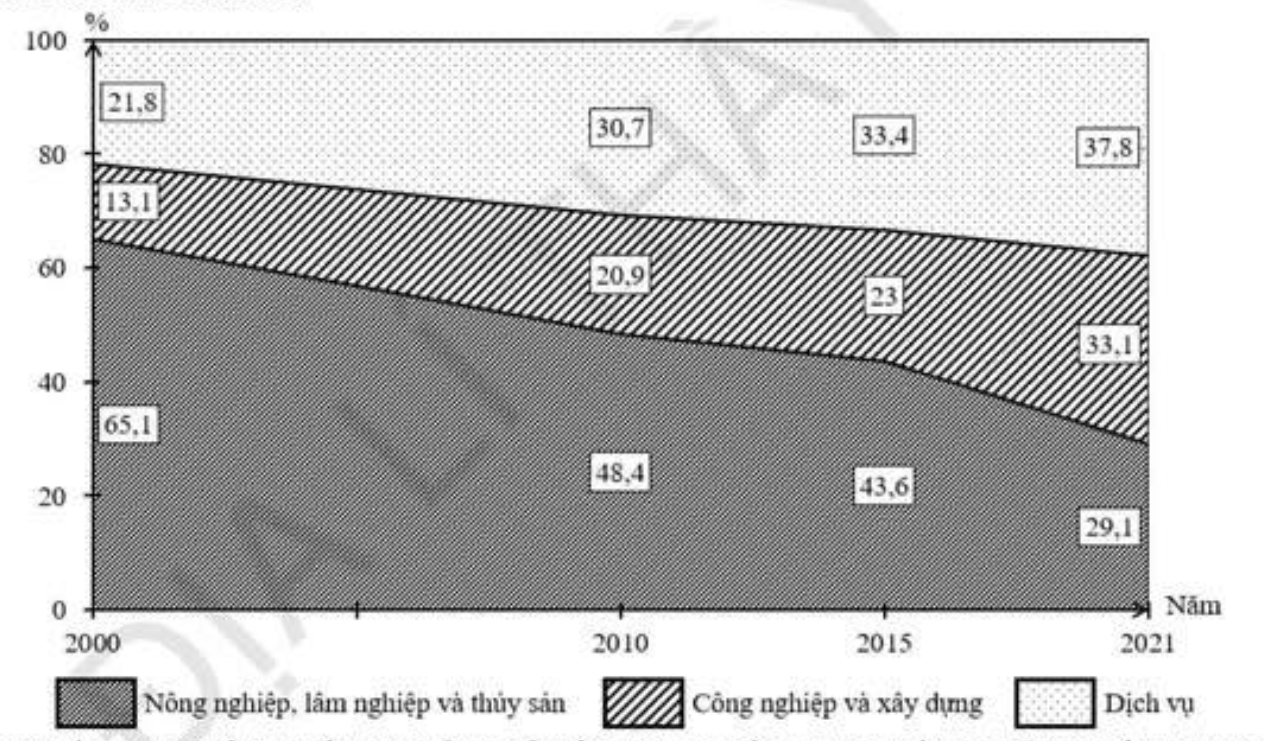 + Theo biểu đồ, tỉ trọng lao động trong ngành nông, lâm và thủy sản đã giảm mạnh từ 65,1% năm 2000 xuống 29,1% năm 2021.