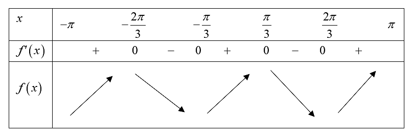 Trên đoạn $\lbrack - \pi;\pi\rbrack$ thì $f'(x) = 0$ có 4 nghiệm $x \in \left\{ \dfrac{- 2\pi}{3};\dfrac{- \pi}{3};\dfrac{\pi}{3};\dfrac{2\pi}{3} \right\}$.
