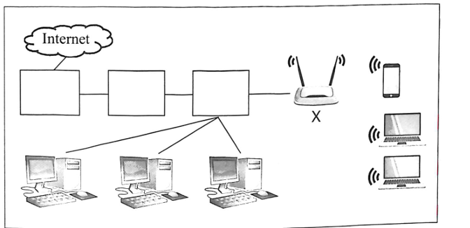 Phương án nào cho bên dưới hình sau chỉ ra đúng tên của thiết bị mạng được kí hiệu " X " ở trong hình?