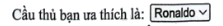 Cầu thủ bạn ưa thích là: <select> <option> Ronaldo </option> <option> Messi</option> <option> Mbappe</option></select>