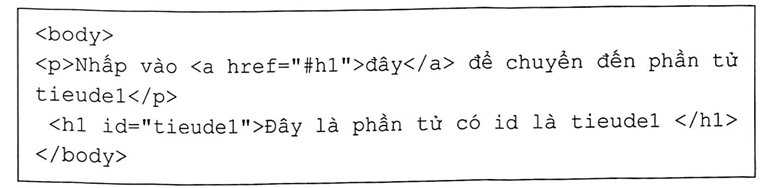 <a href="#h1">, thuộc tính href dùng để chỉ định nơi mà liên kết sẽ dẫn tới. Đoạn mã HTML đang chỉ đến một phần tử có id là h1, trong khi phần tử được định nghĩa với id là tieude1. Đây là lỗi do xác định sai id trong thuộc tính href.<a>, thuộc tính href không phải là herf. Đây là một nhận định sai theo câu trả lời B vì đoạn mã đã sử dụng đúng href.<h1> được dùng để hiển thị tiêu đề lớn nhất, và đang được sử dụng một cách chính xác trong ngữ cảnh này để đặt tiêu đề có id là tieude1.id trong thuộc tính href.id trong thuộc tính href của thẻ <a>.Chú ý khi giải