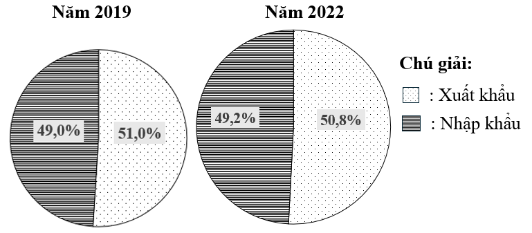 - Phương án C. Năm 2019 xuất siêu, năm 2022 nhập siêu. Năm 2019, xuất khẩu (51,0%) > nhập khẩu (49,0%) => Xuất siêu. Năm 2022, xuất khẩu (50,8%) > nhập khẩu (49,2%) => Xuất siêu. Nên phương án C sai.