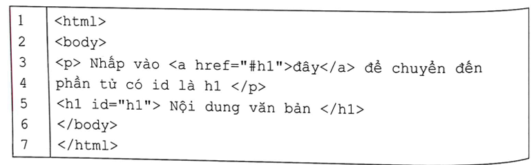 <a> với thuộc tính href="#h1". Đây chính là mã lệnh tạo ra một siêu liên kết.<h1 id="h1"> Nội dung văn bản </h1>