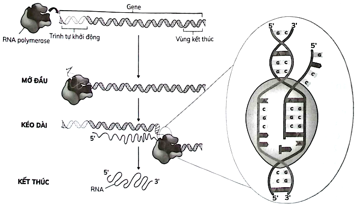 Sơ đồ trong hình minh họa các bước của quá trình tương ứng với hoạt động của RNA polymerase trên mạch DNA:
