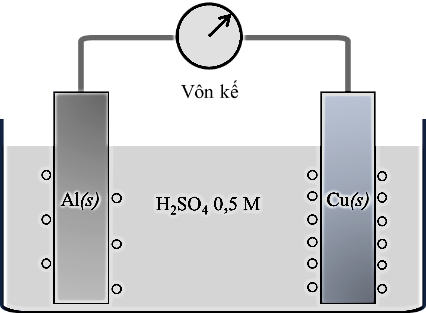 Biết: $E_{Al^{3 +}/Al}^{o} = - 1,676\text{~V}$; $E_{2H^{+}/H_{2}}^{o} = 0\text{~V}$; $E_{Cu^{2 +}/Cu}^{o} = + 0,34\text{~V}$.