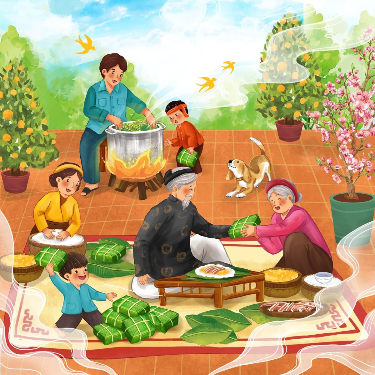 Để trả lời câu hỏi này, ta cần phân tích nội dung và trong hình ảnh. Hình ảnh có thể thấy mọi người đang cùng nhau gói bánh chưng và nấu bánh trong một không gian truyền thống, với các dụng cụ và nguyên liệu cần thiết.