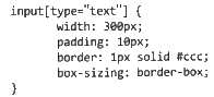 input[type="text"] chỉ định rằng các phần tử <input> có thuộc tính type="text" sẽ được áp dụng kiểu này, và đấy là hộp văn bản.padding: 10px; áp dụng đều cho cả bốn cạnh trên, phải, dưới, trái.border: 1px solid #ccc;, ta thấy đường viền có độ dày 1px, nét liên tục nhưng màu là #ccc (màu xám), không phải màu đen.box-sizing: border-box; làm cho chiều rộng tổng cộng của hộp bao gồm cả đệm và đường viền, do đó chiều rộng nội dung là 300px.Chú ý khi giải