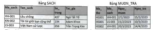 Cho hai bảng SACH và bảng MUON_TRA trong CSDL về thư viện của một trường học như hình sau: