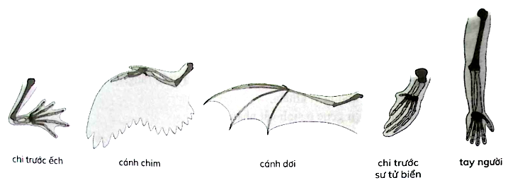 Khi xem xét cấu trúc chi trước hoặc cánh của các loài động vật như ếch, chim, dơi, sư tử biển và người, ta thấy có sự tương đồng về mặt cấu trúc xương. Điều này thể hiện một sự tương đồng có nguồn gốc từ tổ tiên chung, dù chúng đã tiến hoá để thực hiện các chức năng khác nhau như bơi, bay, leo trèo, v.v.