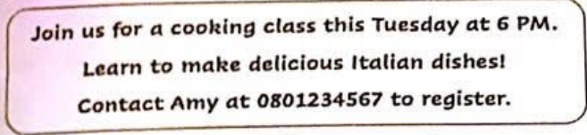 "Hãy tham gia với chúng tôi trong một lớp học nấu ăn vào Thứ Ba lúc 6 giờ chiều. Học cách làm các món Ý ngon miệng. Liên hệ Amy theo số 0801234567 để đăng ký."