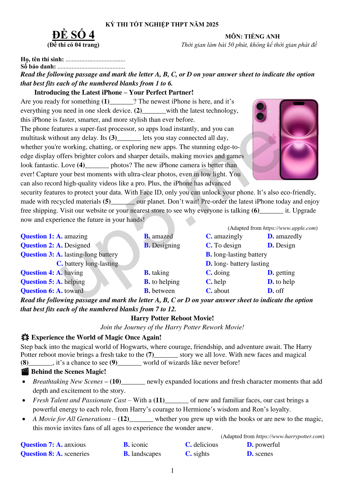 ĐỀ SỐ 4 - MÔN: TIẾNG ANH