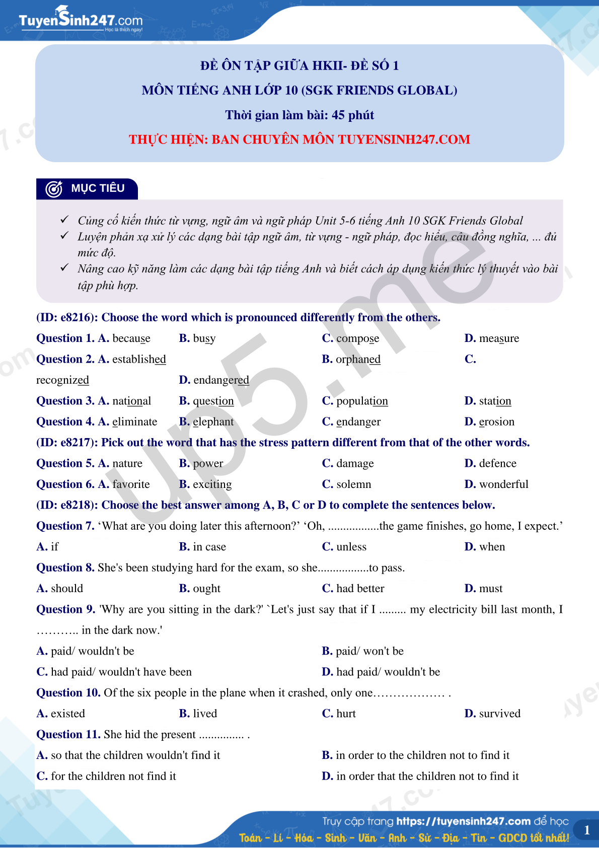 ÔN TẬP GIỮA HKII – ĐỀ SỐ 1