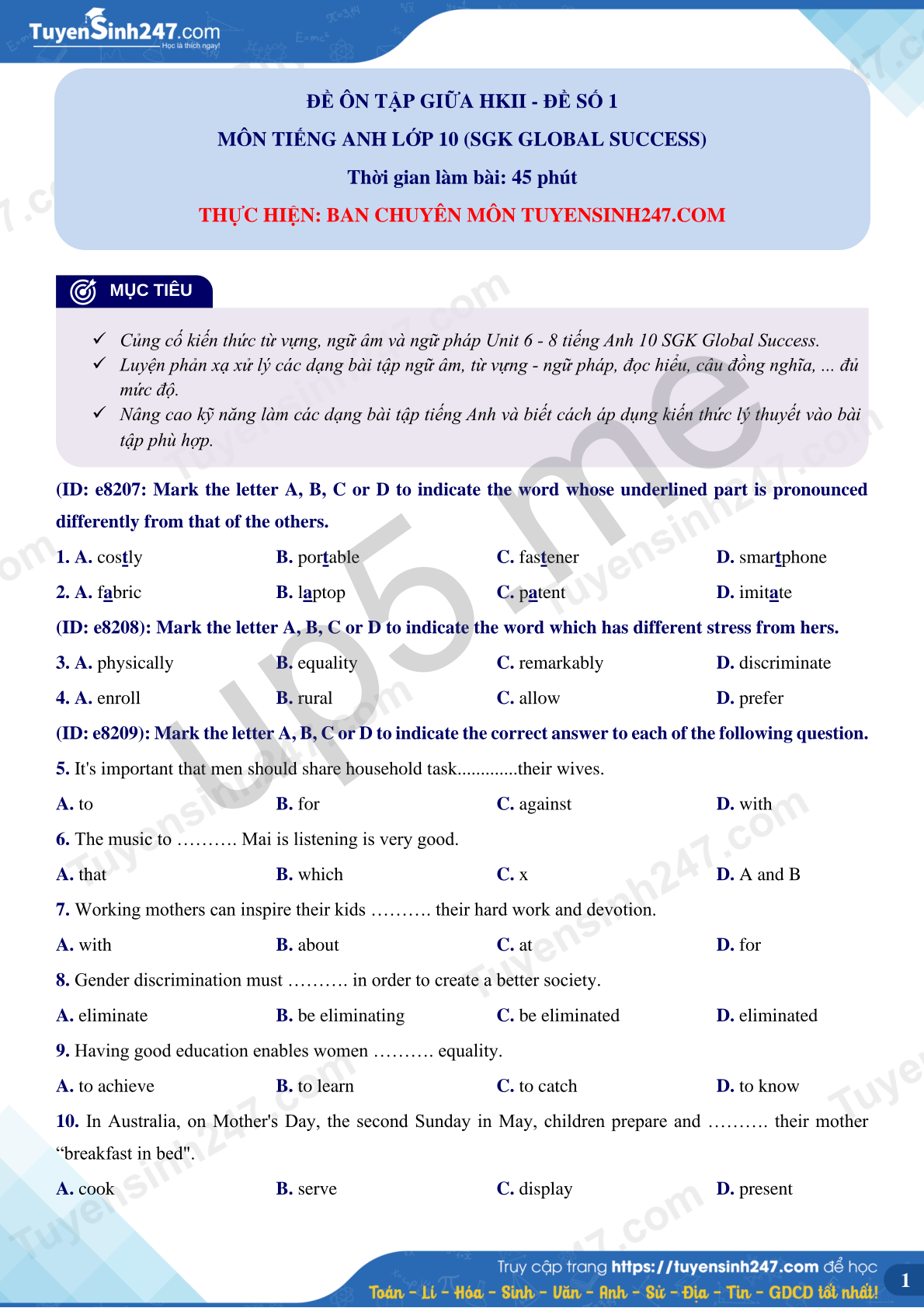 Đề 01 - Ôn tập giữa kì 2 môn Tiếng Anh lớp 10 năm 2024-2025 - Bộ sách Global Success | Kèm Lời giải chi tiết