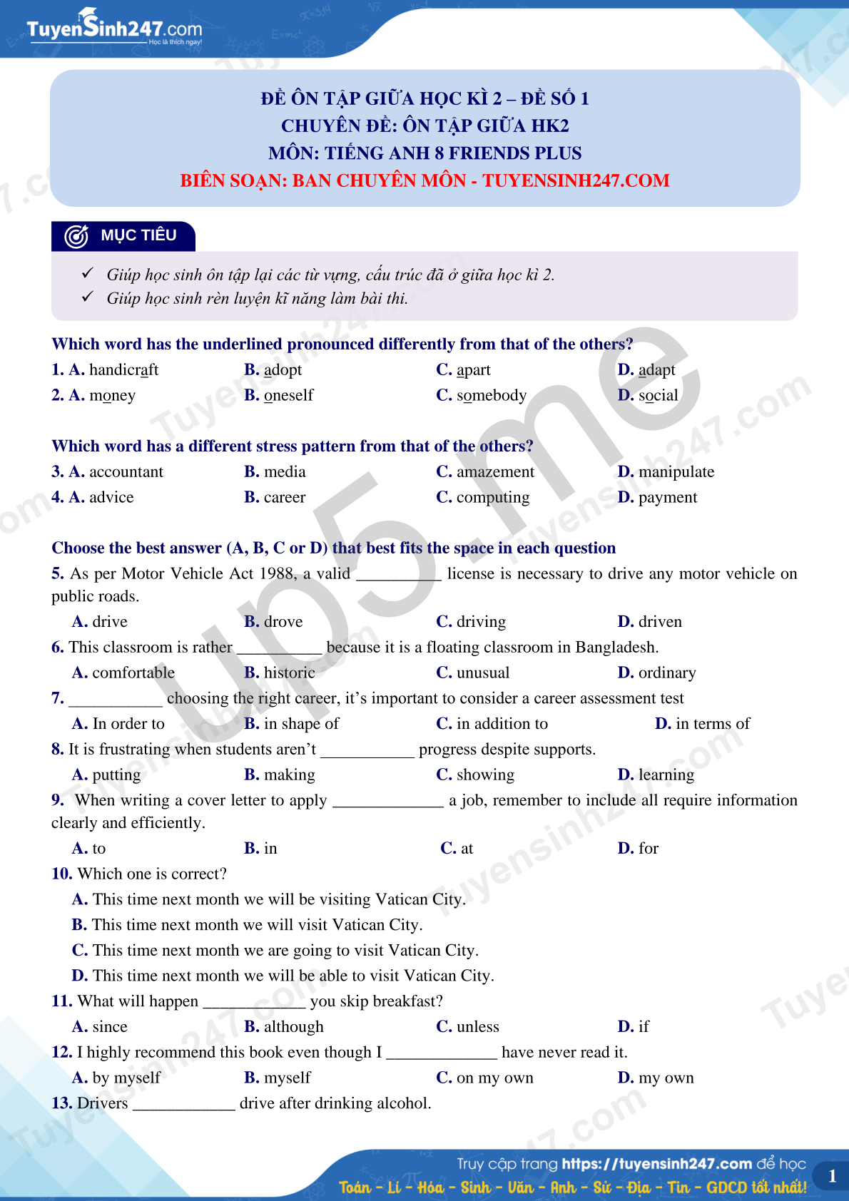 1. A. handicraft B. adopt C. apart D. adapt