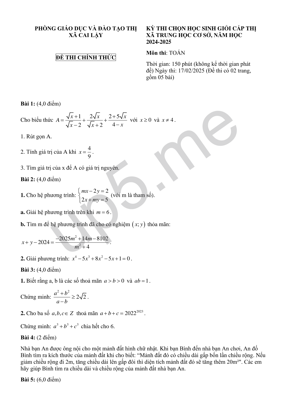 | PHÒNG GIÁO DỤC VÀ ĐÀO TẠO THỊ XÃ CAI LẬYĐỀ THI CHÍNH THỨC | KỲ THI CHỌN HỌC SINH GIỎI CẤP THỊ XÃ TRUNG HỌC CƠ SỞ, NĂM HỌC 2024-2025Môn thi: TOÁNThời gian: 150 phút (không kể thời gian phát đề) Ngày thi: 17/02/2025 (Đề thi có 02 trang, gồm 05 bài) |