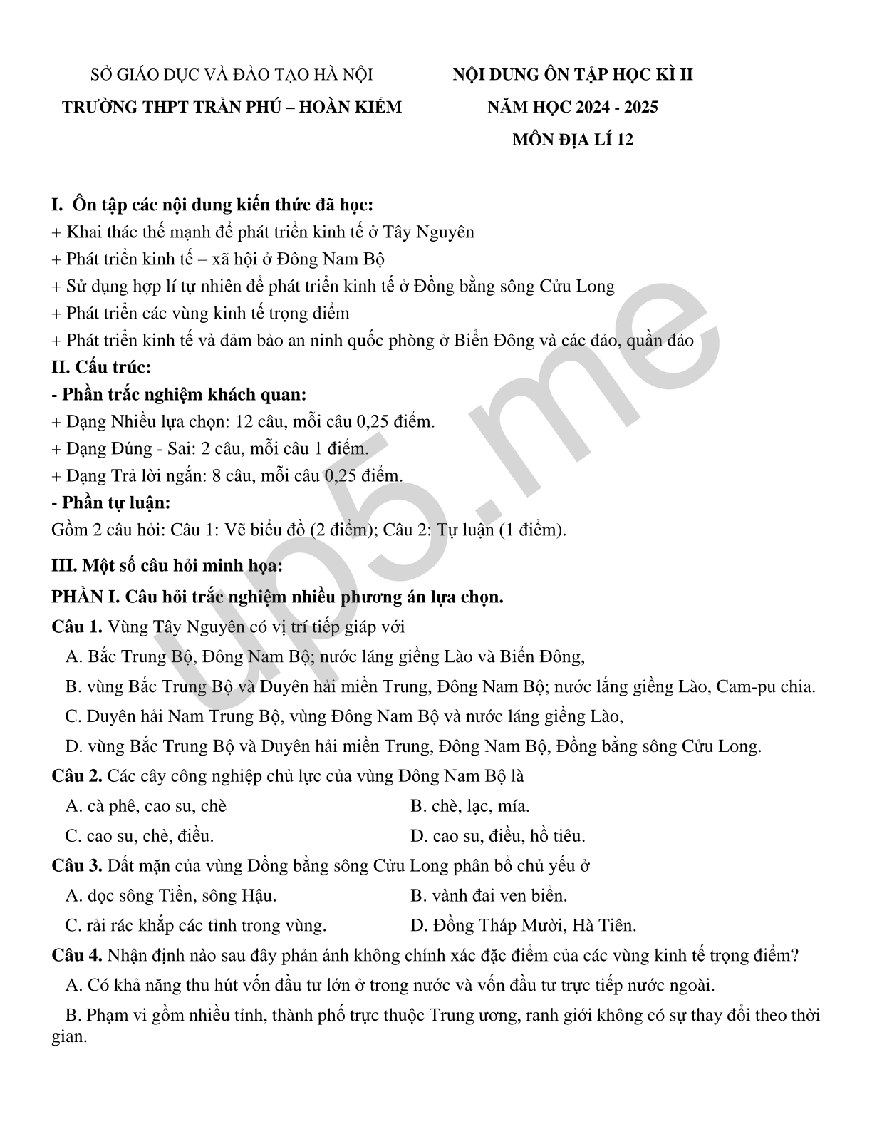 | SỞ GIÁO DỤC VÀ ĐÀO TẠO HÀ NỘITRƯỜNG THPT TRẦN PHÚ – HOÀN KIẾM | NỘI DUNG ÔN TẬP HỌC KÌ IINĂM HỌC 2024 - 2025MÔN ĐỊA LÍ 12 |