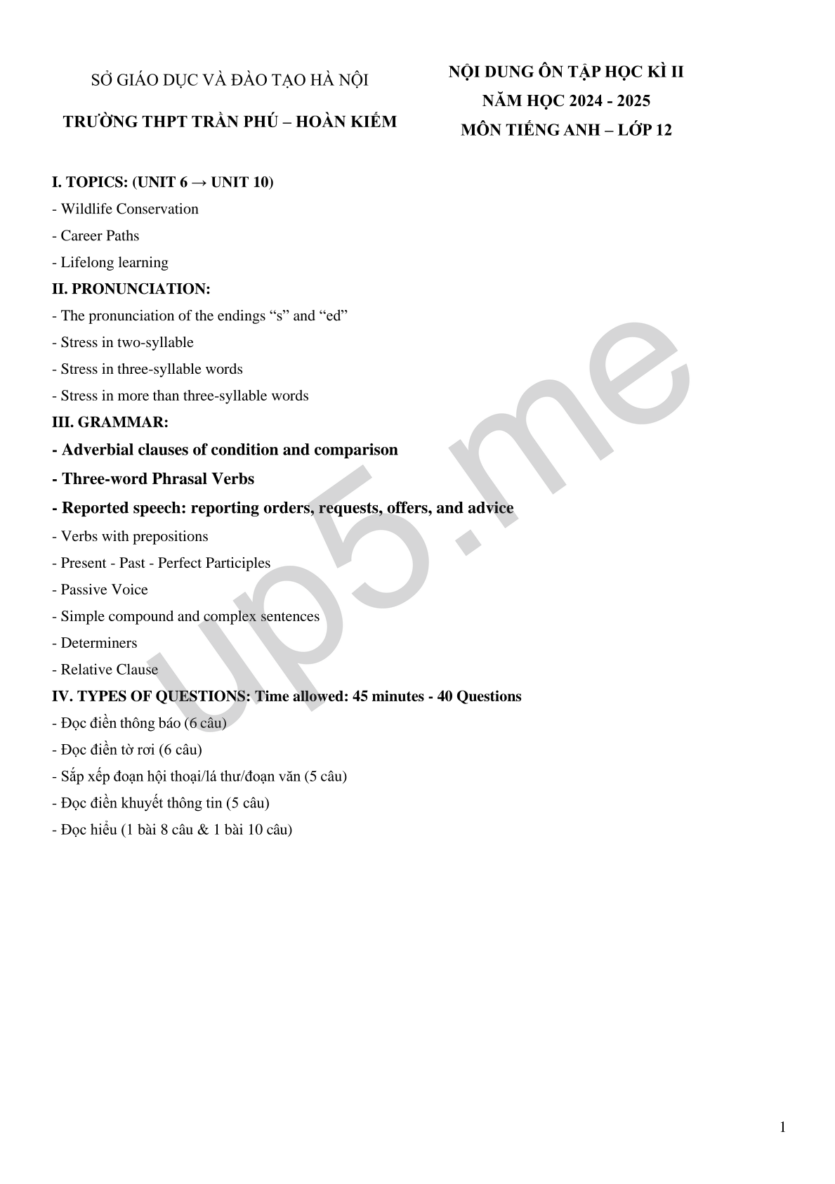 | SỞ GIÁO DỤC VÀ ĐÀO TẠO HÀ NỘITRƯỜNG THPT TRẦN PHÚ – HOÀN KIẾM | NỘI DUNG ÔN TẬP HỌC KÌ IINĂM HỌC 2024 - 2025MÔN TIẾNG ANH – LỚP 12 |