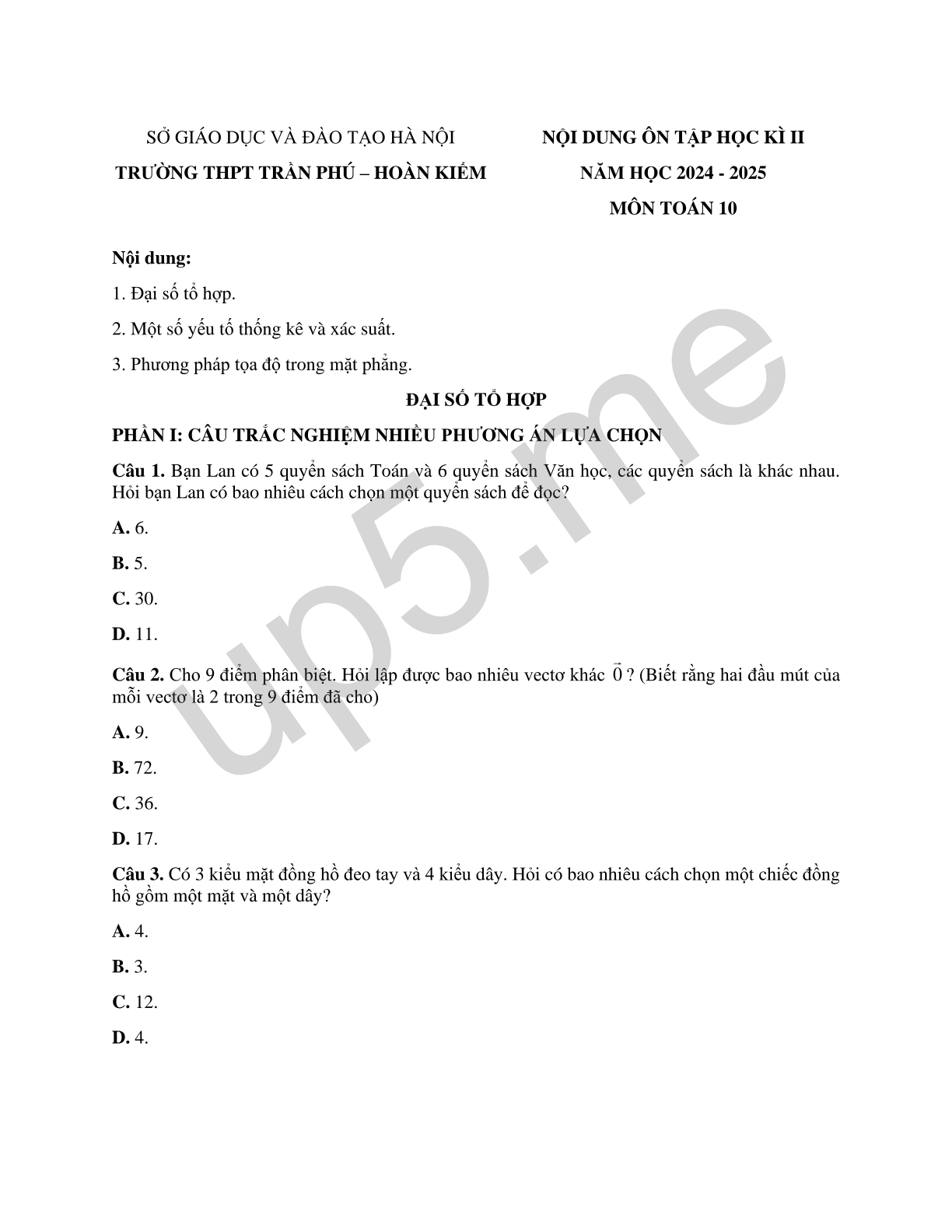 | SỞ GIÁO DỤC VÀ ĐÀO TẠO HÀ NỘITRƯỜNG THPT TRẦN PHÚ – HOÀN KIẾM | NỘI DUNG ÔN TẬP HỌC KÌ IINĂM HỌC 2024 - 2025MÔN TOÁN 10 |