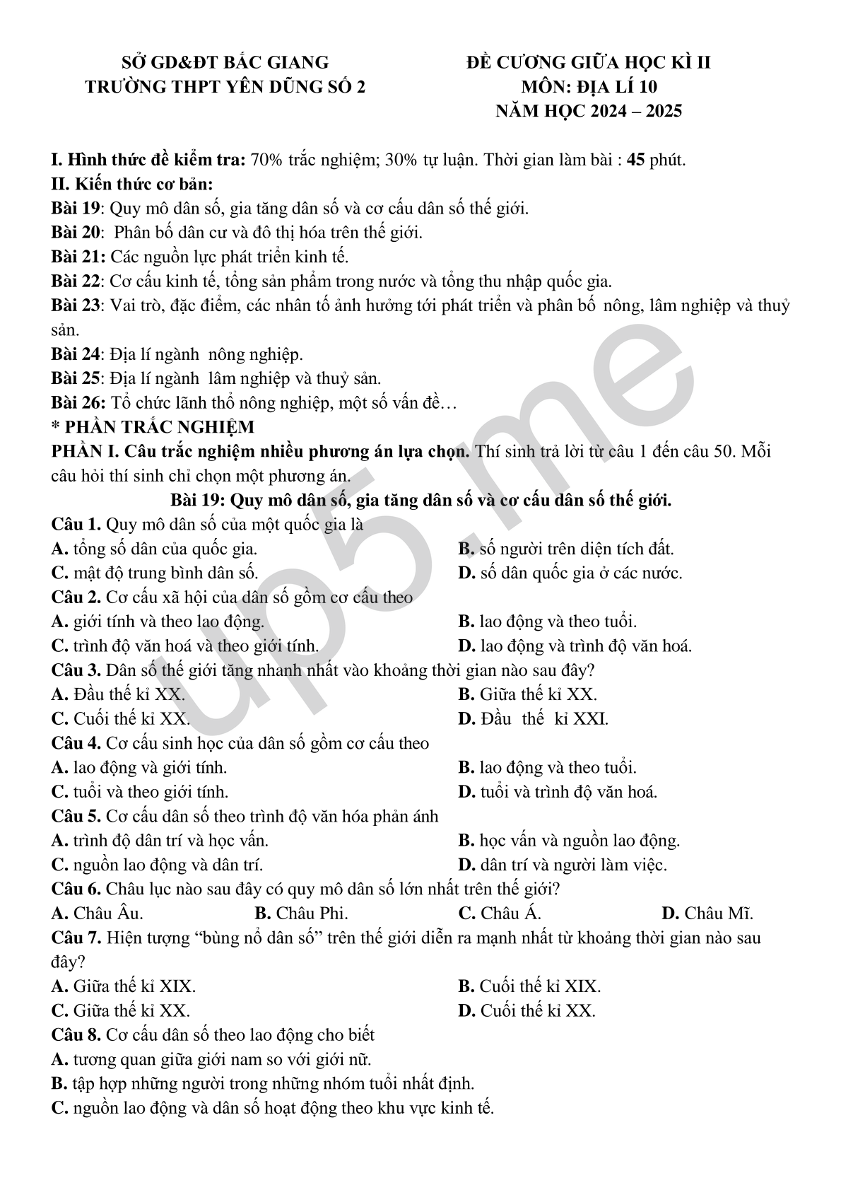 | SỞ GD&ĐT BẮC GIANGTRƯỜNG THPT YÊN DŨNG SỐ 2 | ĐỀ CƯƠNG GIỮA HỌC KÌ IIMÔN: ĐỊA LÍ 10NĂM HỌC 2024 – 2025 |