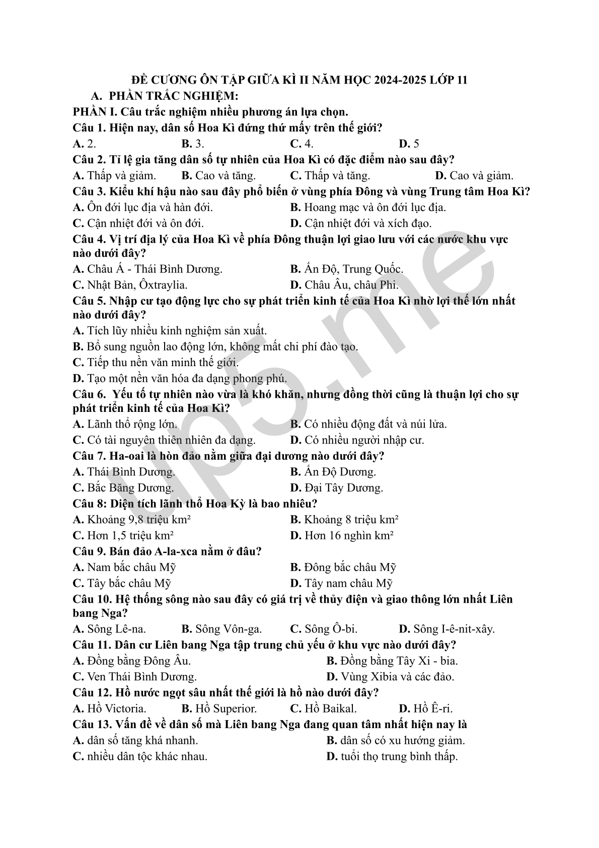 Câu 1. Hiện nay, dân số Hoa Kì đứng thứ mấy trên thế giới?