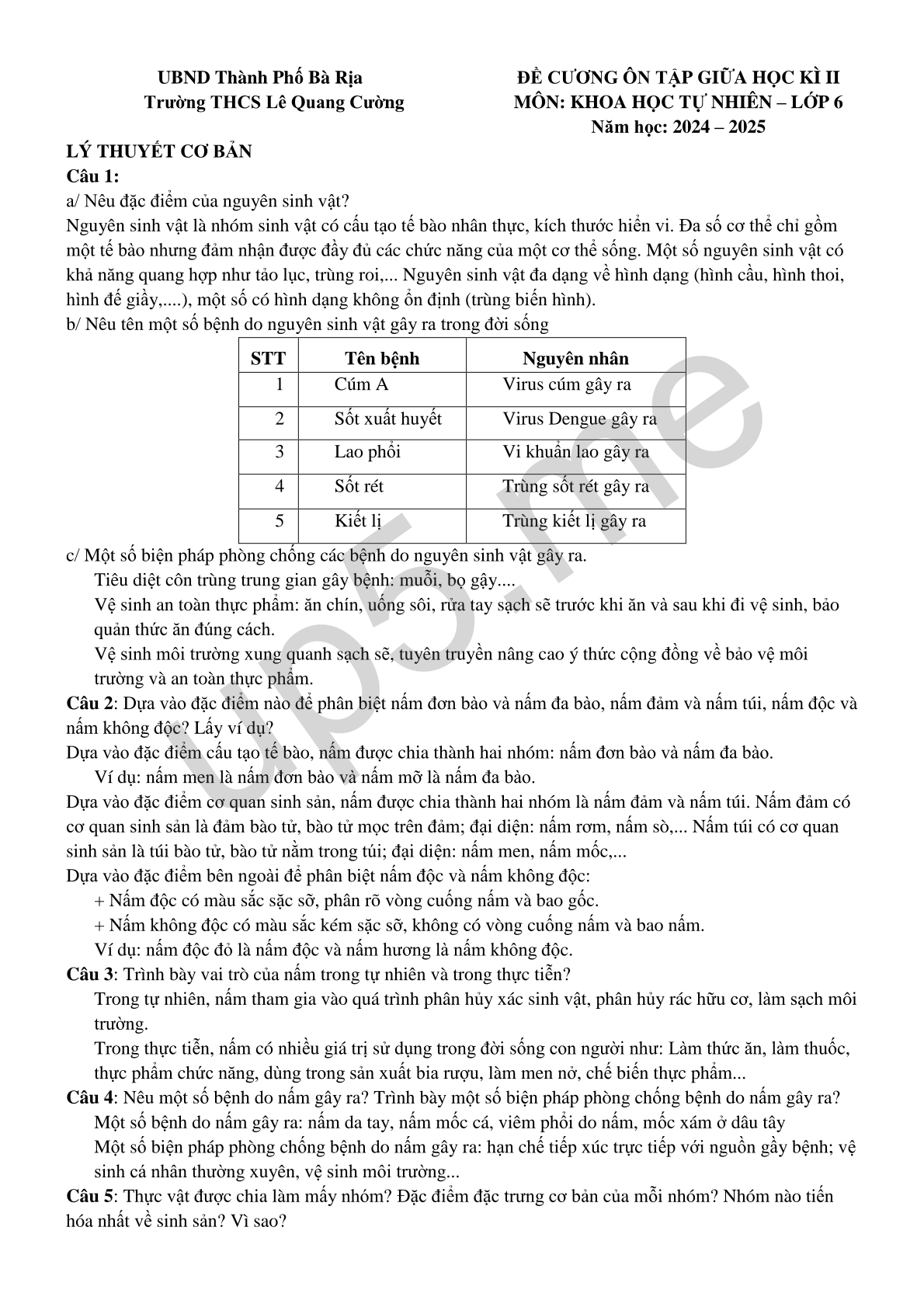 | UBND Thành Phố Bà RịaTrường THCS Lê Quang Cường | ĐỀ CƯƠNG ÔN TẬP GIỮA HỌC KÌ IIMÔN: KHOA HỌC TỰ NHIÊN – LỚP 6Năm học: 2024 – 2025 |