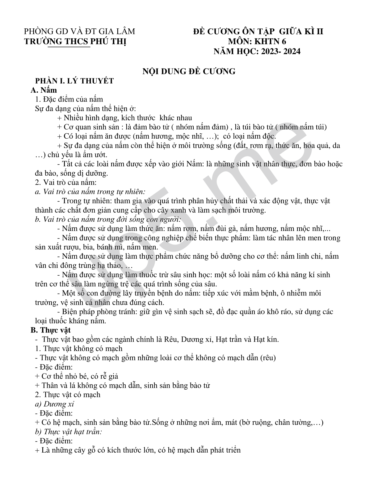 ĐỀ CƯƠNG ÔN TẬP GIỮA KÌ II MÔN: KHTN 6 NĂM HỌC: 2023- 2024 |
