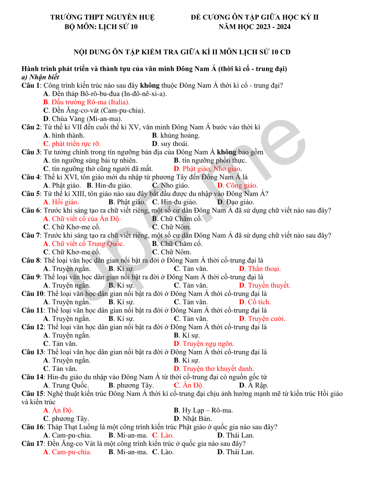 NỘI DUNG ÔN TẬP KIỂM TRA GIỮA KÌ II MÔN LỊCH SỬ 10 CD