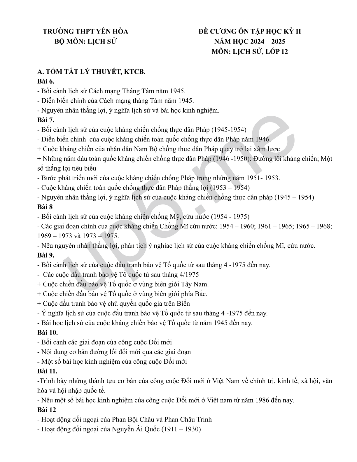 ĐỀ CƯƠNG ÔN TẬP HỌC KỲ II NĂM HỌC 2024 – 2025 MÔN: LỊCH SỬ, LỚP 12 |