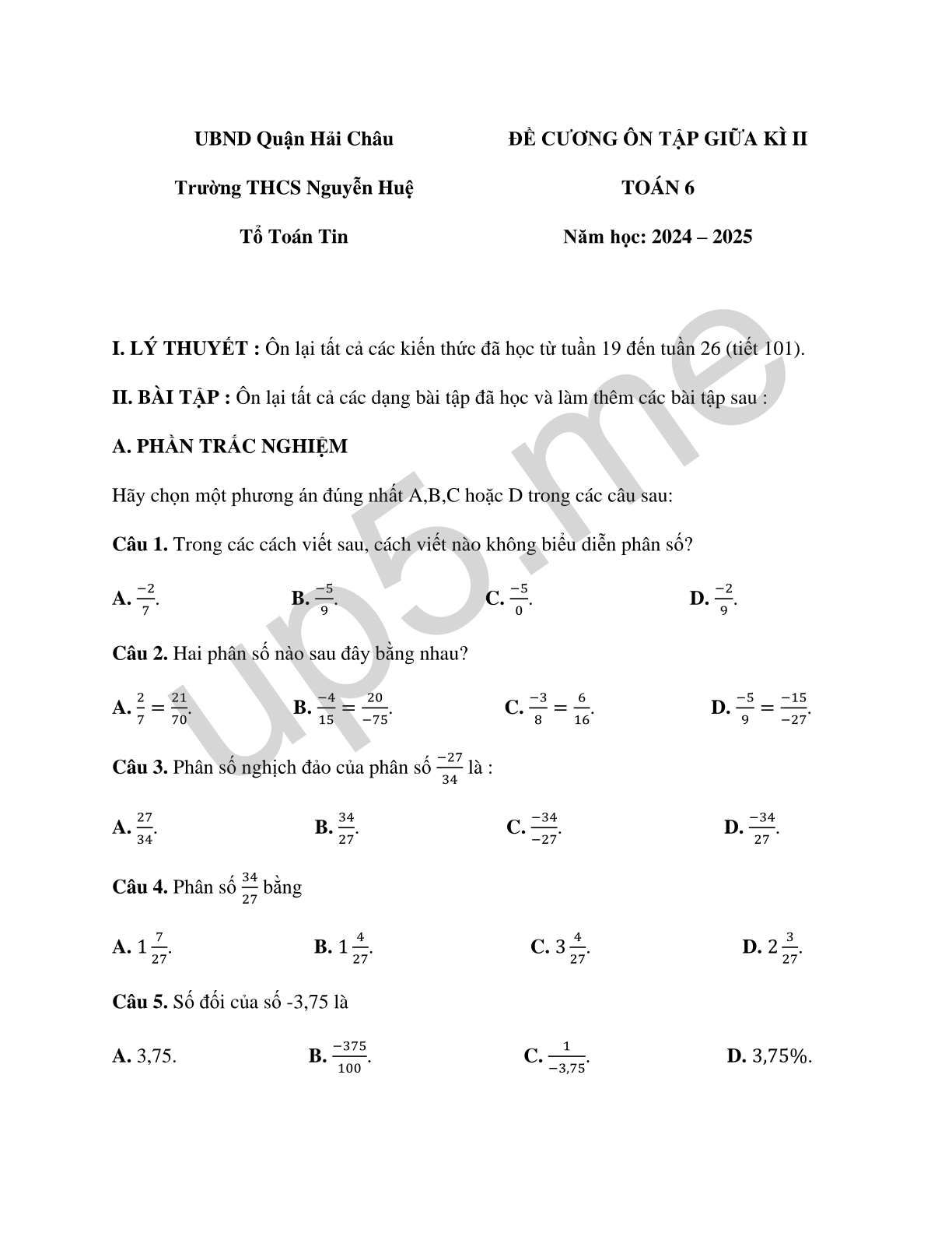 | UBND Quận Hải ChâuTrường THCS Nguyễn HuệTổ Toán Tin | ĐỀ CƯƠNG ÔN TẬP GIỮA KÌ IITOÁN 6Năm học: 2024 – 2025 |