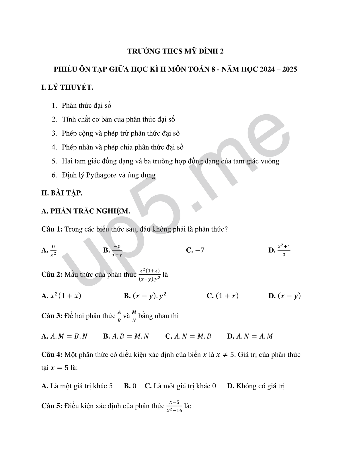PHIẾU ÔN TẬP GIỮA HỌC KÌ II MÔN TOÁN 8 - NĂM HỌC 2024 – 2025