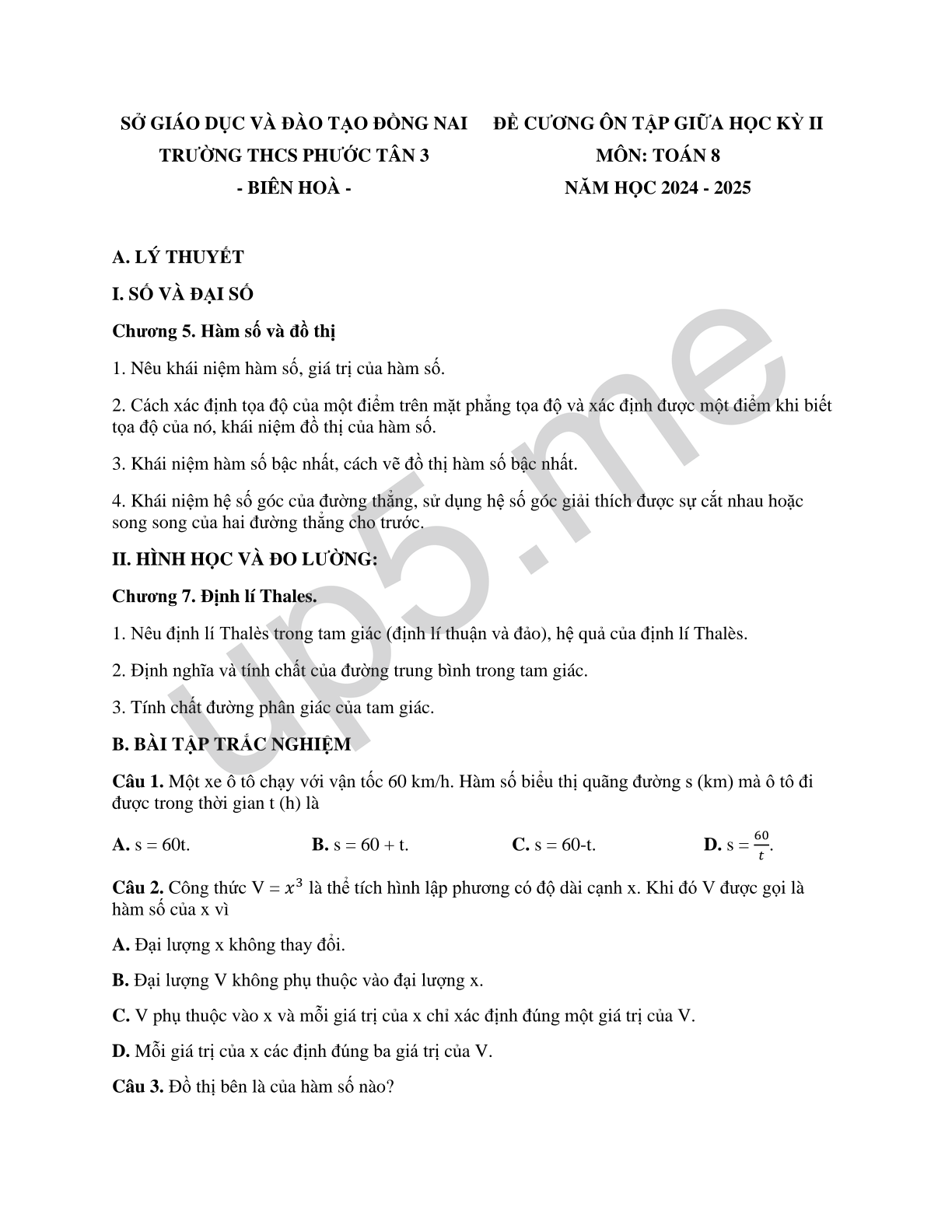 | SỞ GIÁO DỤC VÀ ĐÀO TẠO ĐỒNG NAITRƯỜNG THCS PHƯỚC TÂN 3- BIÊN HOÀ - | ĐỀ CƯƠNG ÔN TẬP GIỮA HỌC KỲ IIMÔN: TOÁN 8NĂM HỌC 2024 - 2025 |