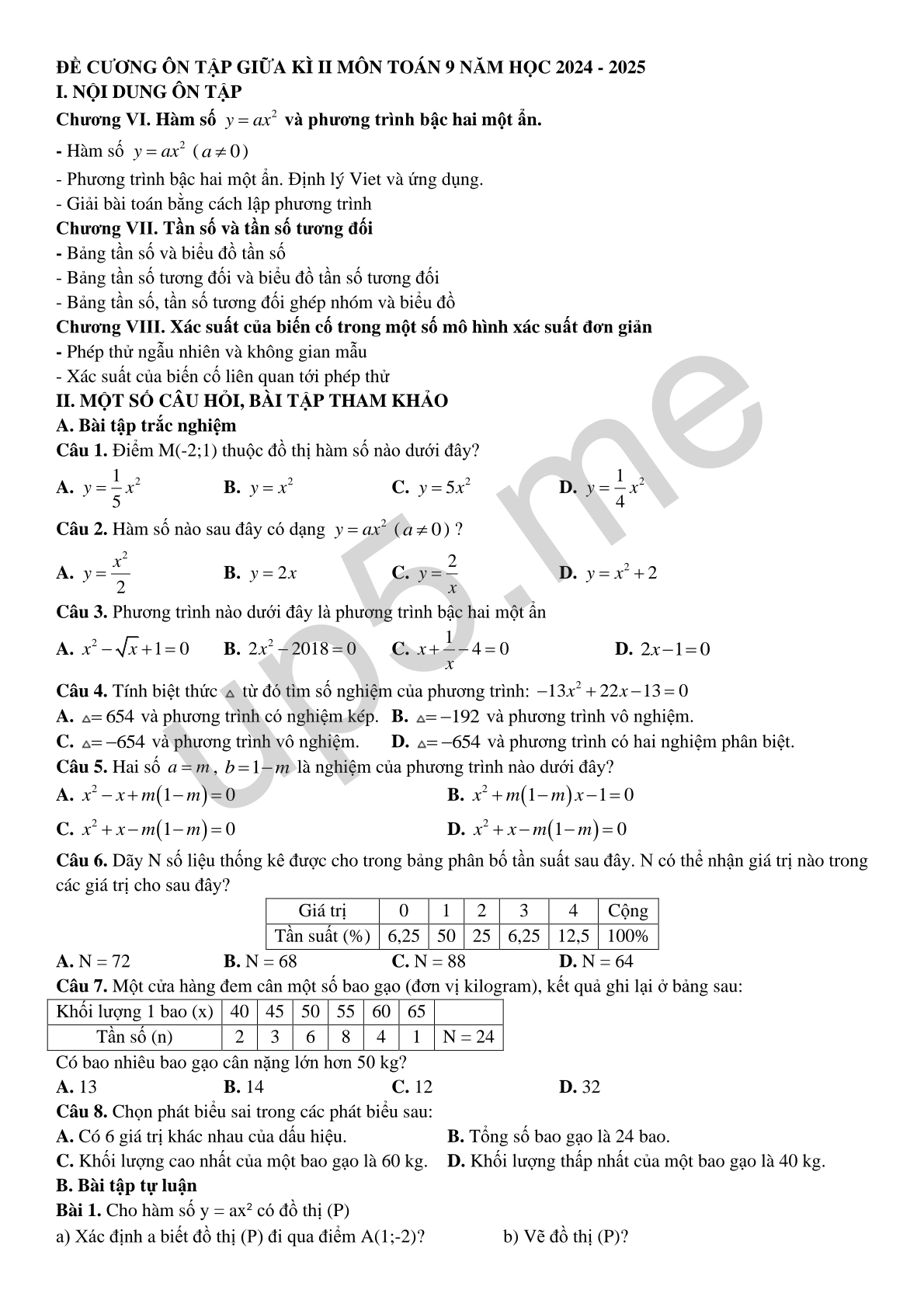 ĐỀ CƯƠNG ÔN TẬP GIỮA KÌ II MÔN TOÁN 9 NĂM HỌC 2024 - 2025