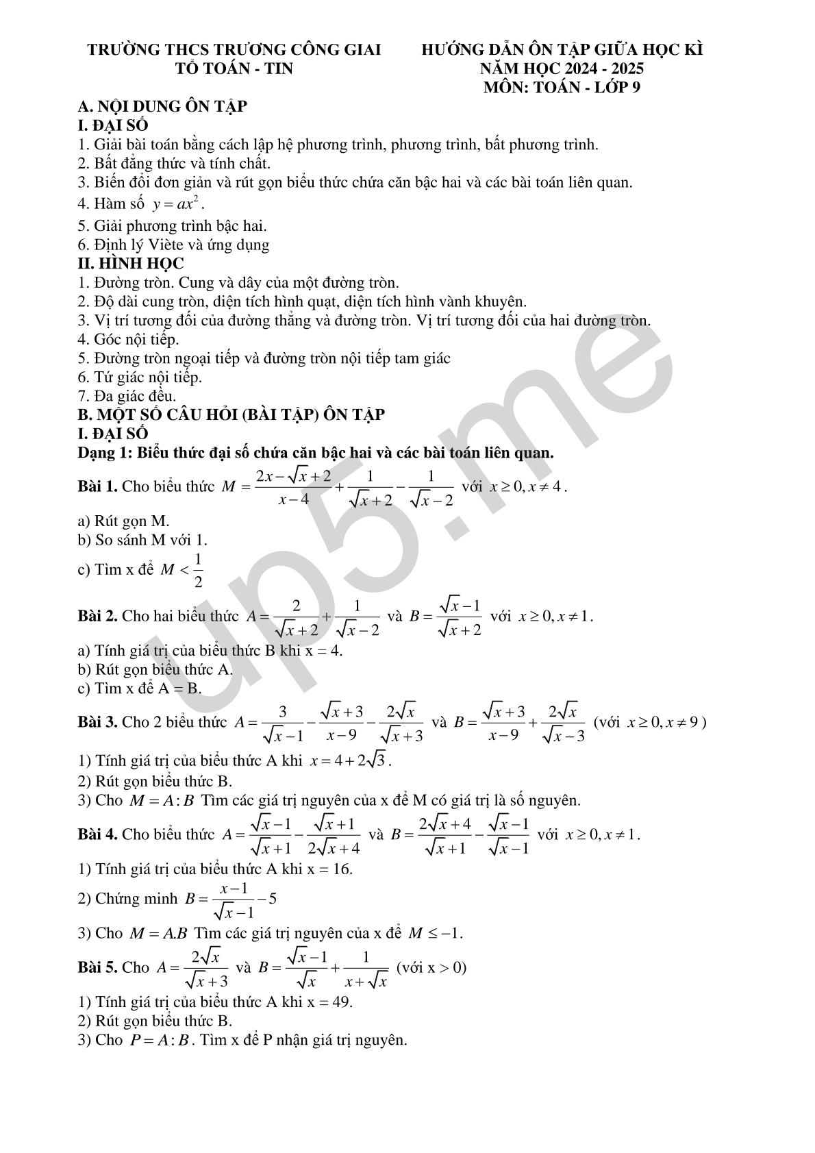 HƯỚNG DẪN ÔN TẬP GIỮA HỌC KÌ NĂM HỌC 2024 - 2025 MÔN: TOÁN - LỚP 9 |