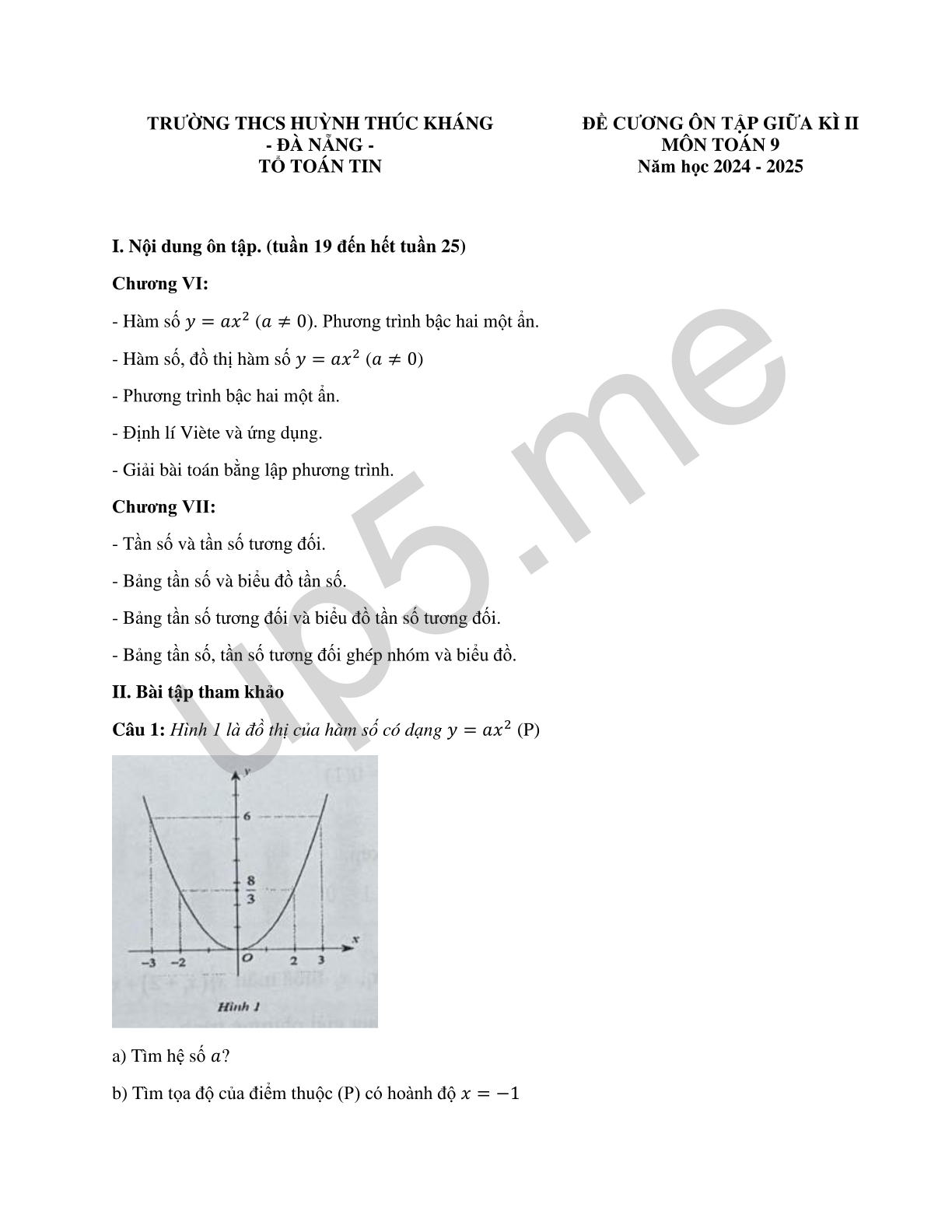 | TRƯỜNG THCS HUỲNH THÚC KHÁNG- ĐÀ NẴNG -TỔ TOÁN TIN | ĐỀ CƯƠNG ÔN TẬP GIỮA KÌ IIMÔN TOÁN 9Năm học 2024 - 2025 |