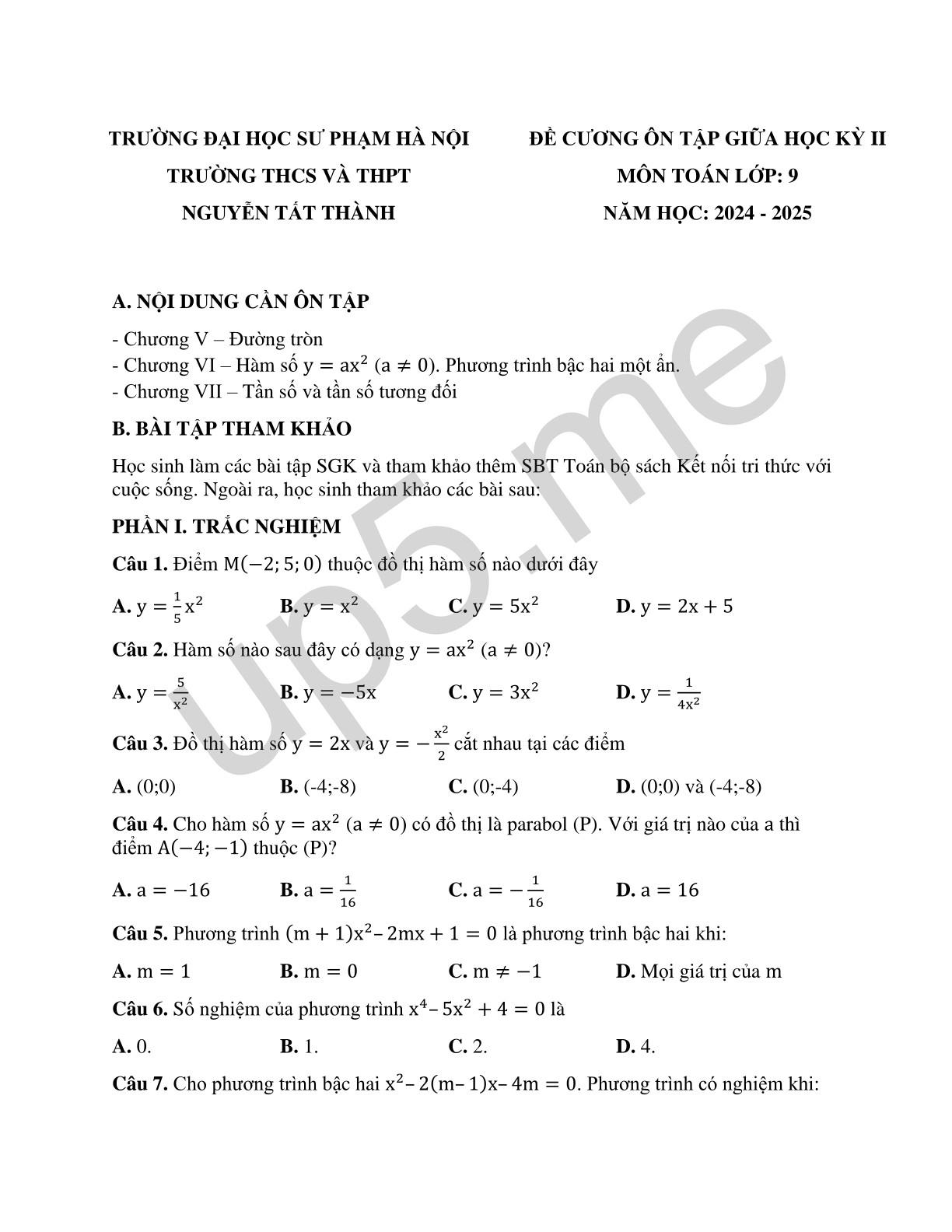 ĐỀ CƯƠNG ÔN TẬP GIỮA HỌC KỲ II MÔN TOÁN LỚP: 9 NĂM HỌC: 2024 - 2025 |