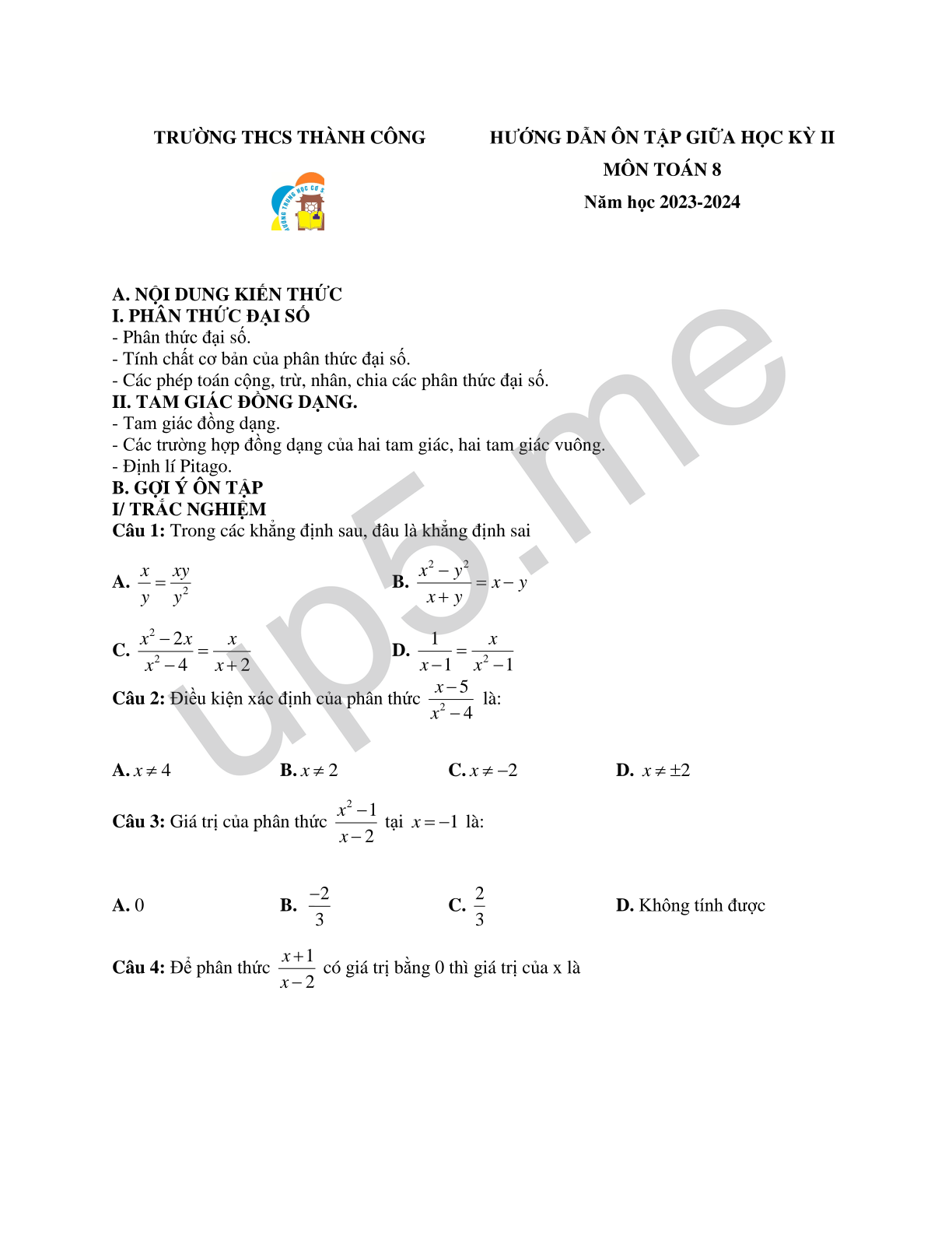 HƯỚNG DẪN ÔN TẬP GIỮA HỌC KỲ II MÔN TOÁN 8 Năm học 2023-2024 |